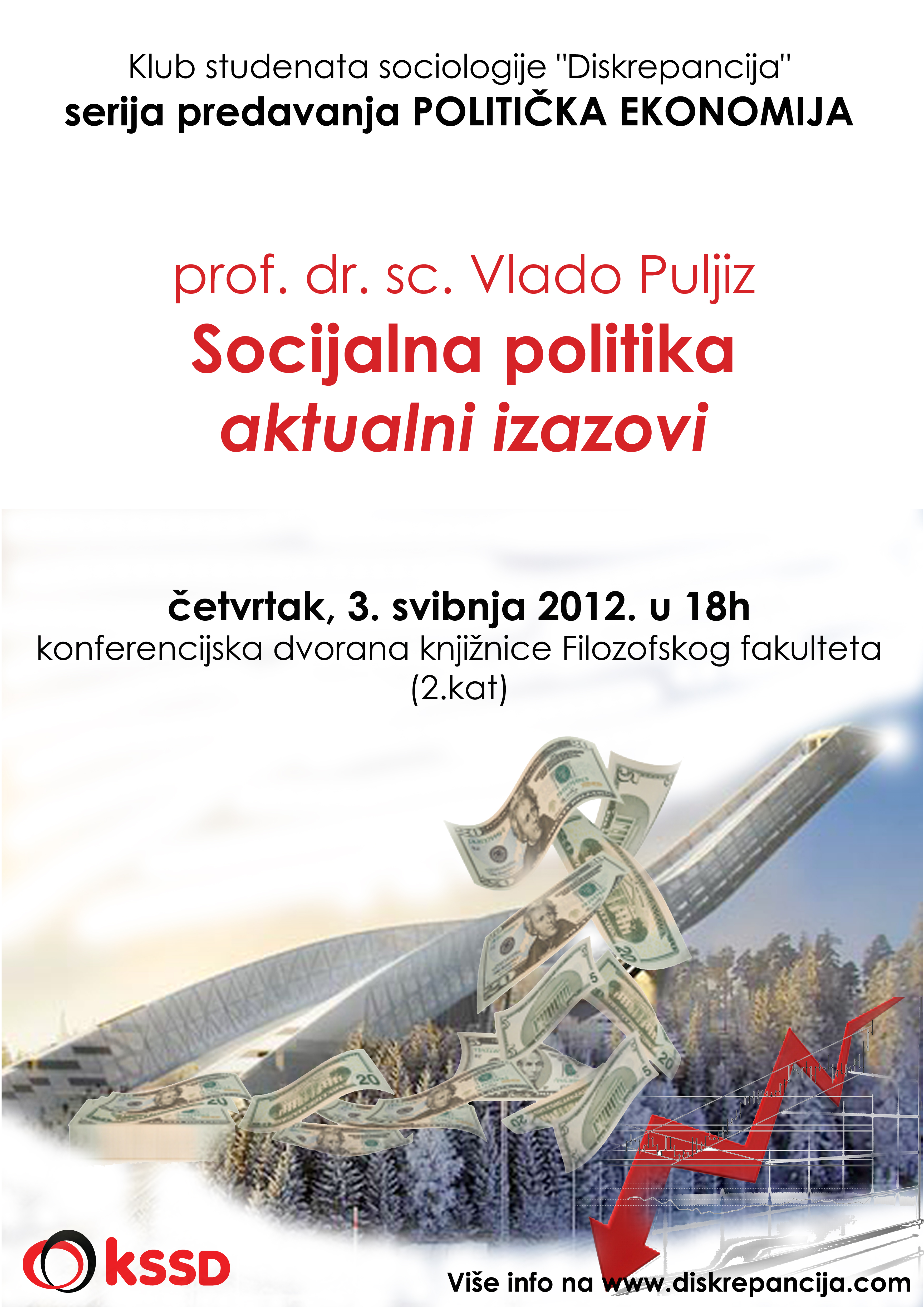 Prvo predavanje u nizu bit će predavanje prof.dr.sc. Vlade Puljiza s Pravnog fakulteta (Studijski centar socijalnog rada) koje će se održati u četvrtak, 03. svibnja 2012. u 18:00h u konferencijskoj dvorani knjižnice Filozofskog fakulteta (2.kat) na temu “Socijalna politika – aktualni izazovi”.