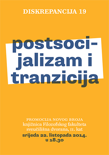 Pozivamo vas na promociju novog 19. broja časopisa Diskrepancija s tematom “Postsocijalizam i tranzicija”. Promocija će se održati u srijedu 22.10.2014. u 18:30 h u konferencijskoj dvorani Knjižnice Filozofskog fakulteta (2. kat). Časopis će nakon promocije biti dostupan i u on-line izdanju na Hrčku, a za sve koji žele primjerak Diskrepancije na svojim policama za knjige preporučamo dolazak.