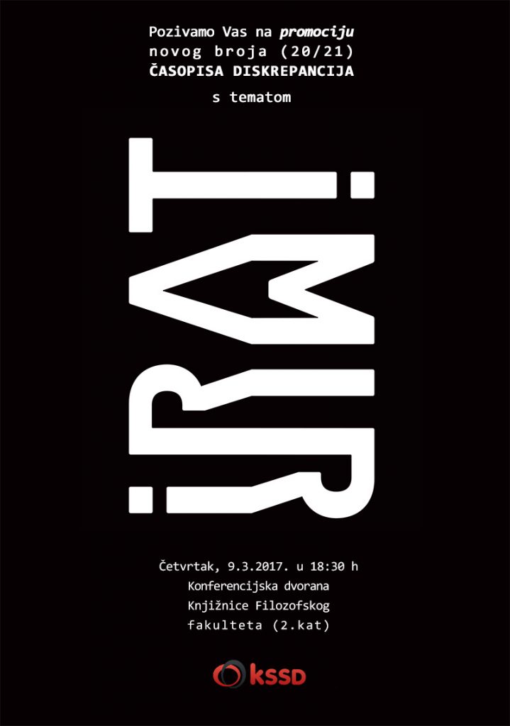 Uredništvo časopisa Diskrepancija poziva Vas na promociju novog broja 20/21 s tematom „Rat i mir“.